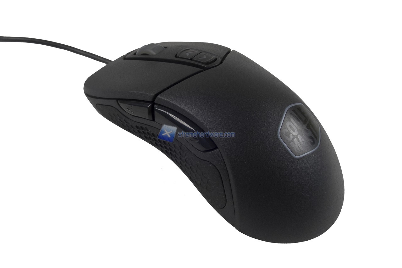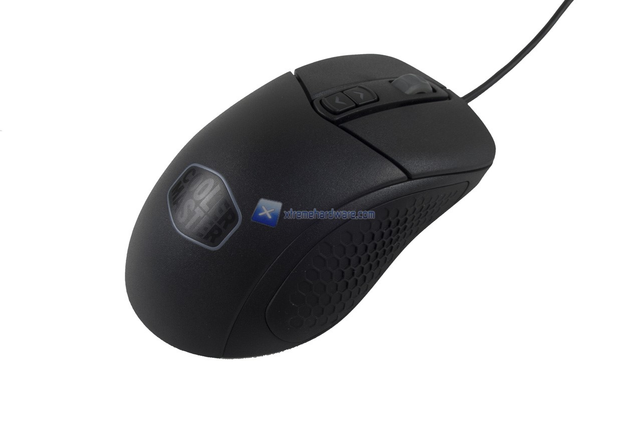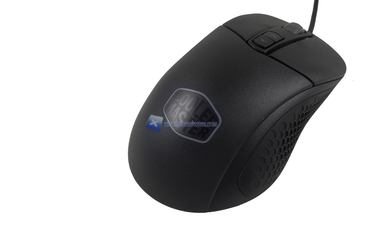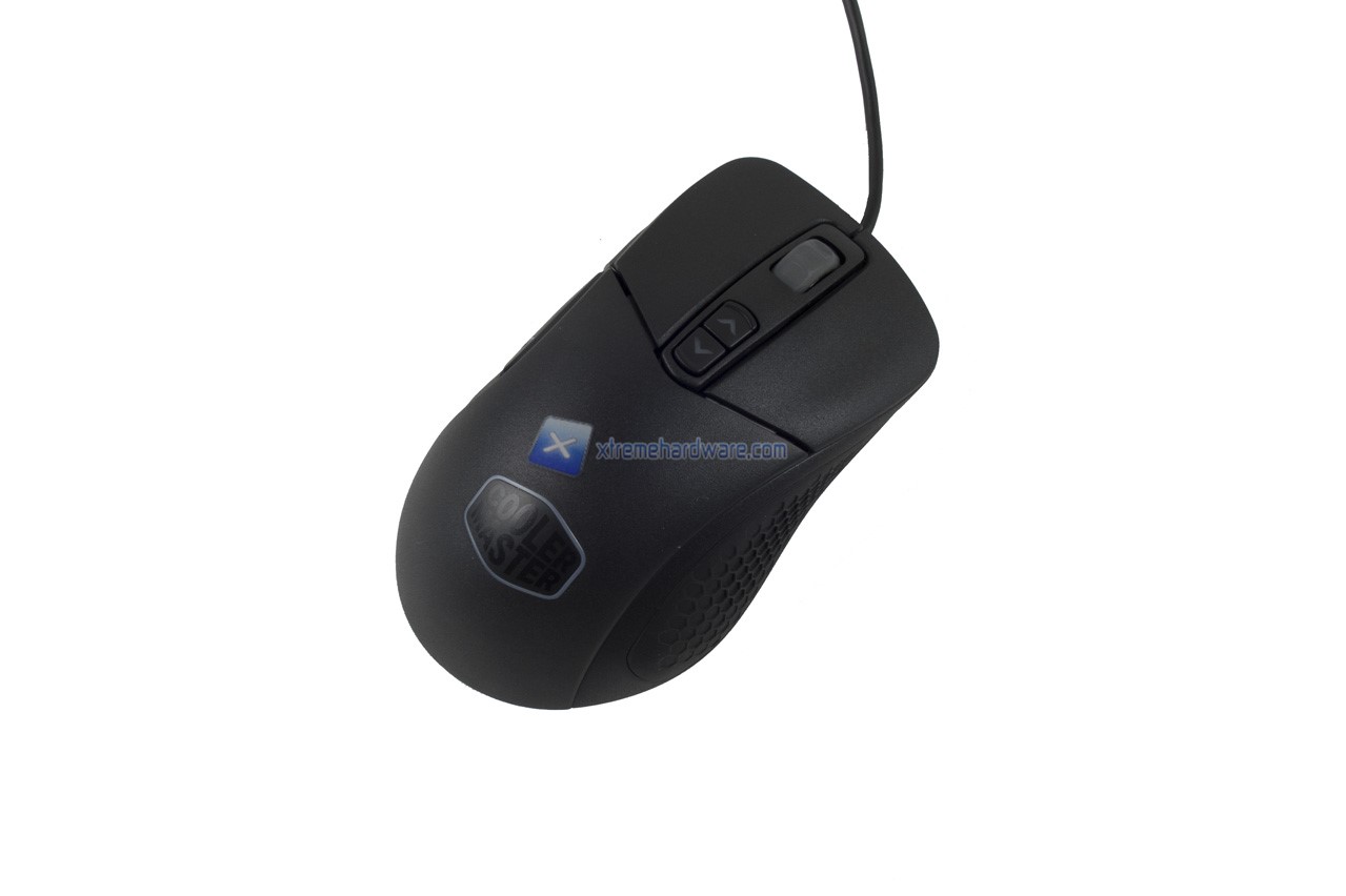 Nel dorso del mouse possiamo osservare il logo Cooler Master di cui il perimetro/contorno esagonale verrà retroilluminato di un colore a nostro piacimento o colore con effetto. E’ possibile inoltre notare già la superficie rugosa che migliorerà il Grip sul mouse stesso.