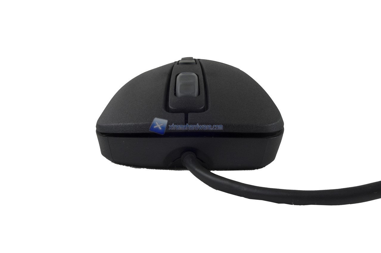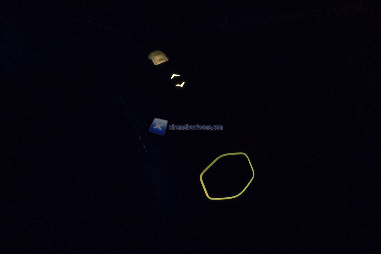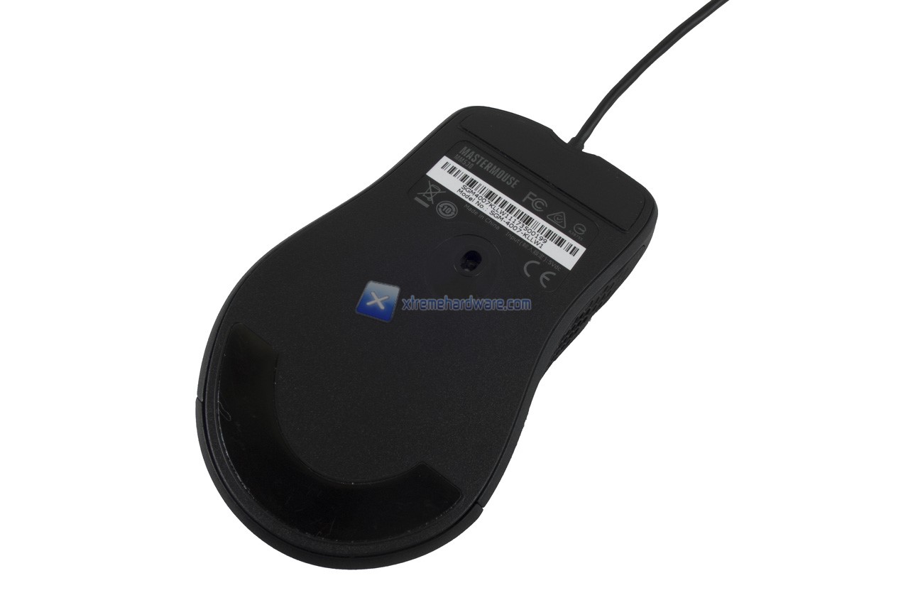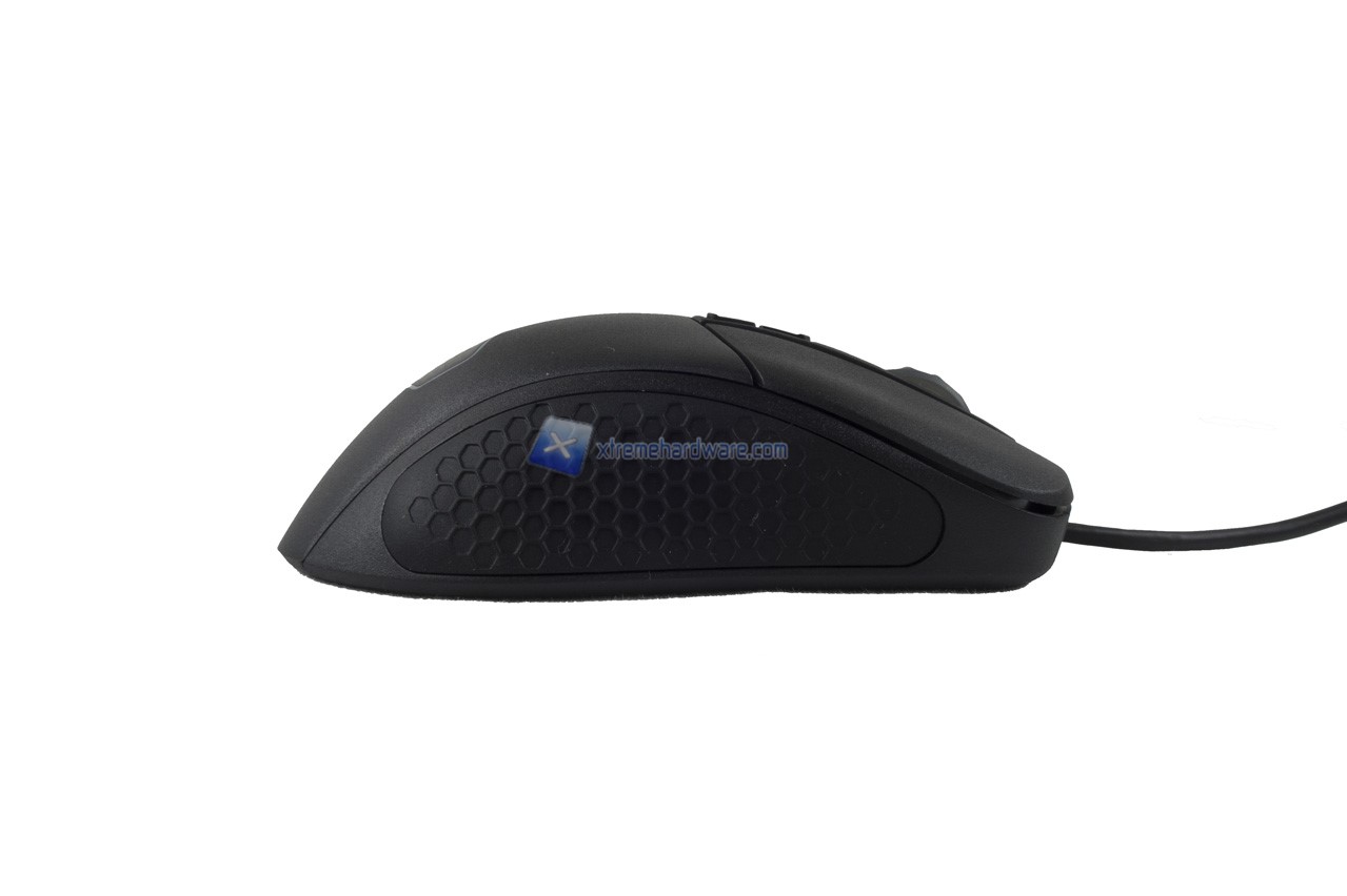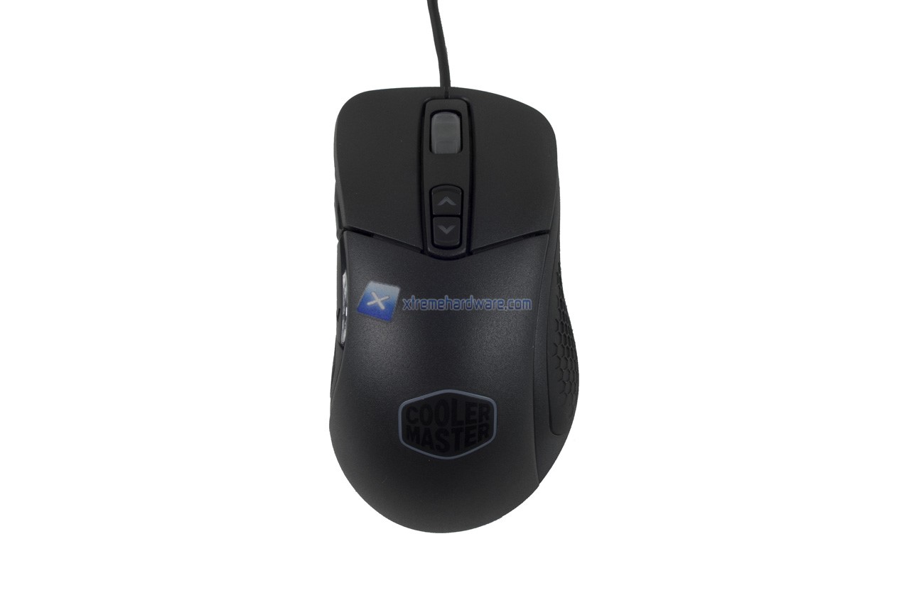 Nel dorso del mouse possiamo osservare il logo Cooler Master di cui il perimetro/contorno esagonale verrà retroilluminato di un colore a nostro piacimento o colore con effetto. E’ possibile inoltre notare già la superficie rugosa che migliorerà il Grip sul mouse stesso.