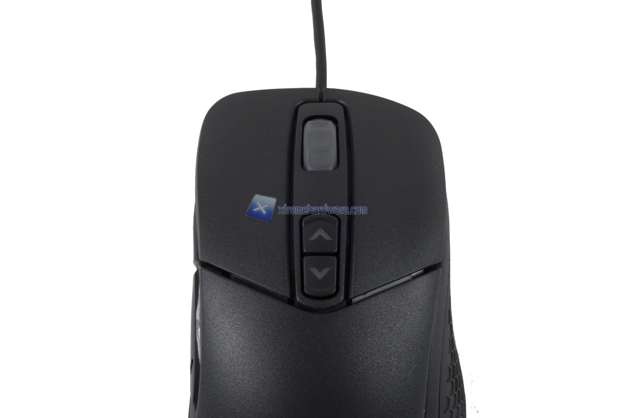 La zona avanzata/frontale si completa di due tasti per lo switch dei 4 Profili DPI possibili, una rotellina di tipo cliccabile con rivestimento gommato e infine due tasti principali con switch Omron. Da notare il taglio e forma a V nel lato inferiore e curvato dei tasti principali nella parte alta. I tasti DPI e la rotellina andranno a completare insieme al logo Cooler Master poc’anzi visto le tre zone con retroilluminazione RGB.
