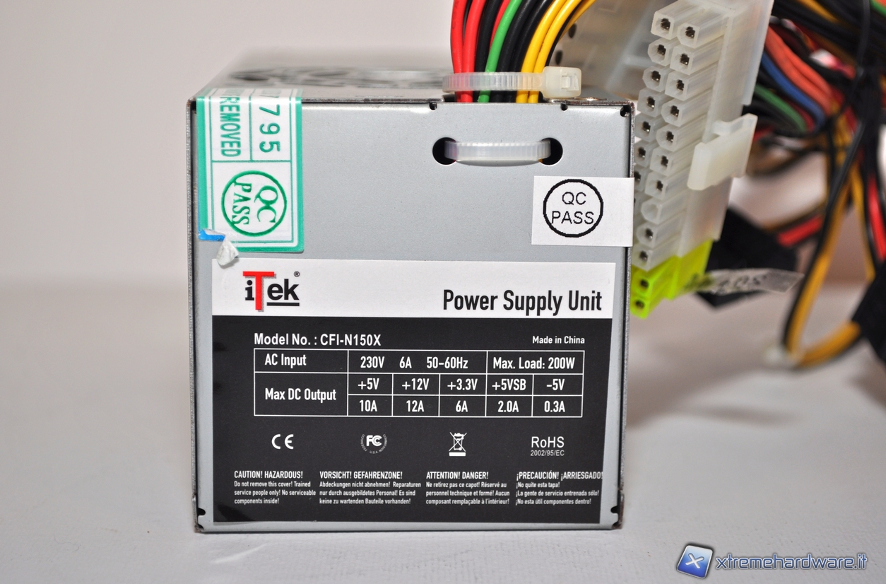 L’alimentatore integrato è sempre della stessa Itek in grado di fornire circa 200W in output con gli amperaggi indicati nell’etichetta sovrastante. L’alimentatore non è di ottima fattura ma comunque più che sufficiente ad alimentare l’intero sistema HTPC. Per altri utilizzi questo alimentatore potrebbe risultare insufficiente, d’altra parte l’obiettivo principale di Itek è stato di ridurne le dimensioni rispetto ad uno con standard ATX. Notiamo inoltre uno switch 230V-110V che ci fa supporre l’utilizzo di un PFC di tipo passivo.