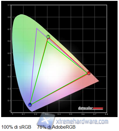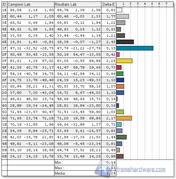 Il profilo colore va a togliere quell’effetto nebbia detto precedentemente, ma i valori non risultano ancora soddisfacenti, principalmente a causa di un elevato punto del nero (leggasi anche “contrasto basso”) e dell'esponente gamma che rimane ancora su un valore piuttosto basso. La copertura gamut rimane la medesima e la temperatura del bianco migliora di poco, mentre il valore medio del Delta-E registra un buon guadagno, passando da 3,32 a 1,24.