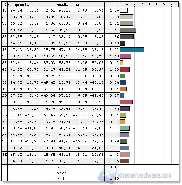 La fedeltà cromatica nelle condizioni out-of-box risulta molto buona, con un Delta-E medio di 1,28.