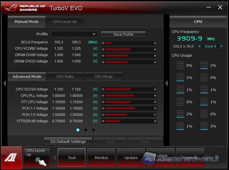 Grazie al solido sistema di alimentazione DIGI+ che accompagna la Rampage IV Formula come tutta la serie ROG, si può agire anche tramite l’interfaccia software Asus DIGI+ regolando il livello del Load-line Calibration, molto importante per rendere quanto più stabile possibile l’erogazione della tensione alla CPU anche in presenza di forte assorbimento. Altro tool fondamentale per effettuare l’overclock del sistema senza dover ogni volta riavviare e rientrare nel bios, è il conosciutissimo TurboV EVO che vi mostriamo di seguito: