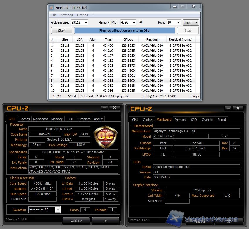 Usufruendo di un sistema di raffreddamento a liquido siamo riusciti ad overcloccare il processore ed a farlo rimanere stabile sotto LINX fino alla frequenza di 4500 MHz. Noto tool di stress, LINX si avvale delle librerie Linpack della Intel ed è in grado di portare il carico su tutti i core della CPU prossimo al 100 %. Per questo l’esecuzione di suddetto test e la buona riuscita è particolarmente gravosa non solo per la quantità di calore prodotto che ovviamente dev’essere smaltito, ma anche per i vari sottosistemi di alimentazione della scheda madre. Notate la bontà della CPU che possiamo affermare fortunata in quanto ha richiesto solo 1,188 volt di erogazione per chiudere il test. Rispetto al Core i7 3770K con il quale riuscivamo ad essere stabili a 4800 MHz, Haswell sembra opporre qualche resistenza in più anche per via del maggior calore generato.